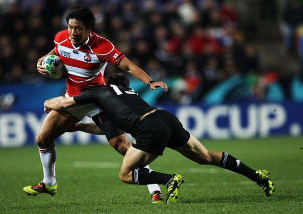 Koji Taira of Japan is tackled by Conrad Smith